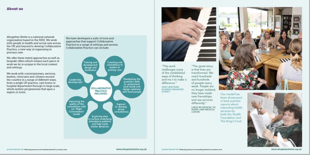 Altogether Better is an NHS national network organisation offering innovative support for health and social care services in the UK and beyond. Their model for 'Collaborative Practice', involving local communities in the delivery of health care services, was well received by the people they worked with, but they struggled to explain it simply.